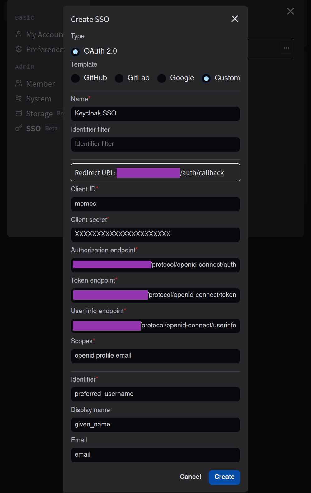 - Set "Username" to anything you want. If you want to use SSO for your existing Memos account, set it to your Memos username.